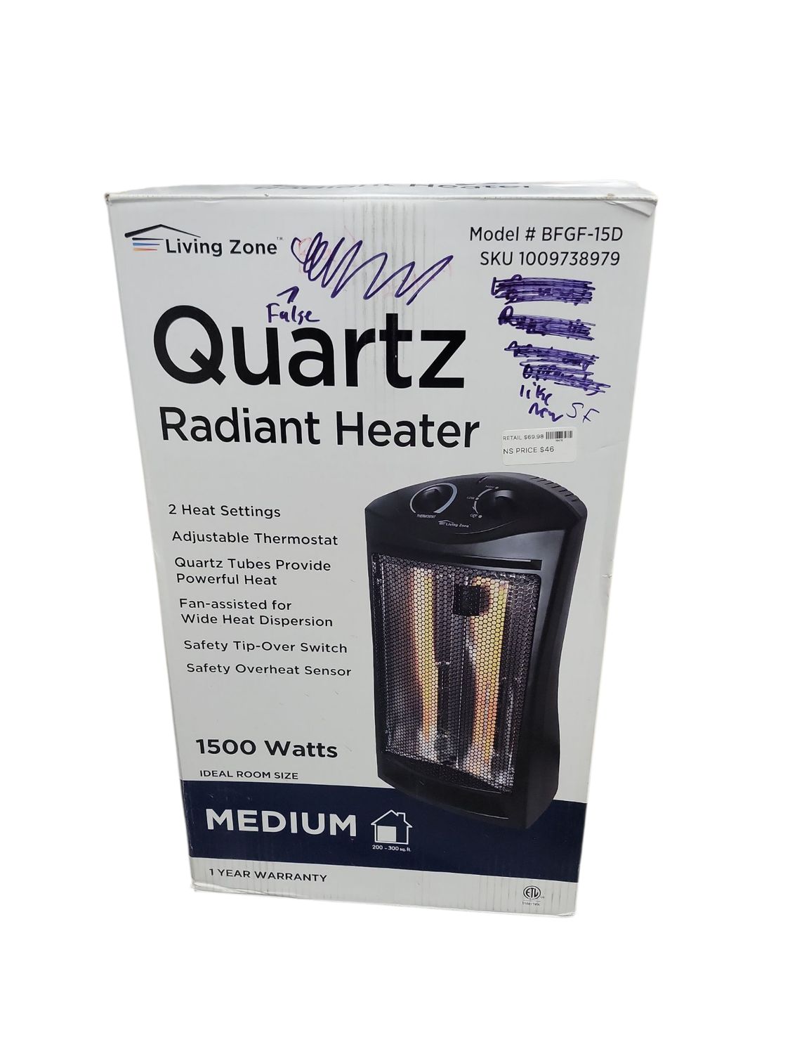 living zone 1500-Watt Black Electric Tower Quartz Infrared Space Heater with Thermostat BFGF-15D